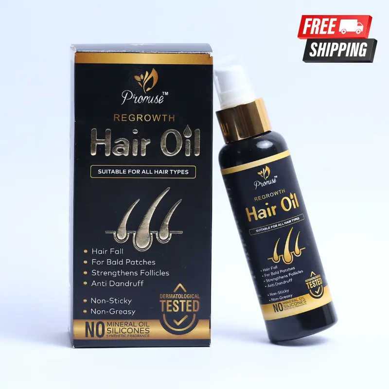Promise Regrowth Hair Oil is a powerful, 100% natural formula designed to help reduce hair fall, stimulate regrowth on bald patches, and deeply nourish your scalp. This oil is made with a blend of organic ingredients that strengthen hair follicles, reduce dandruff, and restore shine and thickness to your hair. Suitable for all hair types, this oil provides a non-sticky, non-greasy solution for healthier hair.
